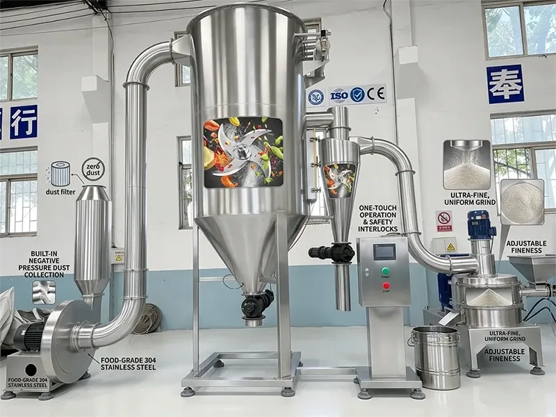 4. Veilig en milieuvriendelijk, in overeenstemming met de normen: de gehele machine heeft een volledig afgedicht ontwerp, zonder stoflekkage, waardoor de werkomgeving schoner wordt en strikt wordt voldaan aan de milieueisen; De combinatie van materialen van voedingskwaliteit en het GMP-standaardontwerp zorgt ervoor dat het gemalen fruit- en groentepoeder geurloos en vrij van vervuiling is en direct kan worden gebruikt in hoogwaardige scenario's zoals voedselverwerking en de productie van gezondheidsproducten; Het bedrijfsgeluid van de apparatuur wordt binnen een redelijk bereik gecontroleerd en veroorzaakt geen interferentie met de omgeving.