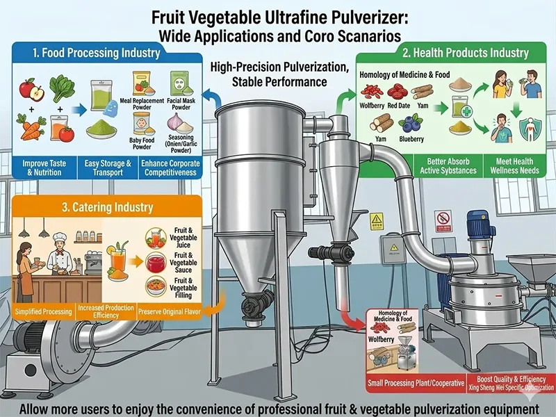 De Fruit Groente Ultrafine Pulverizer, met zijn hoge precisie verpletterende voordeel en stabiele prestaties, wordt veel gebruikt op meerdere gebieden. De belangrijkste toepassingsscenario's zijn als volgt: