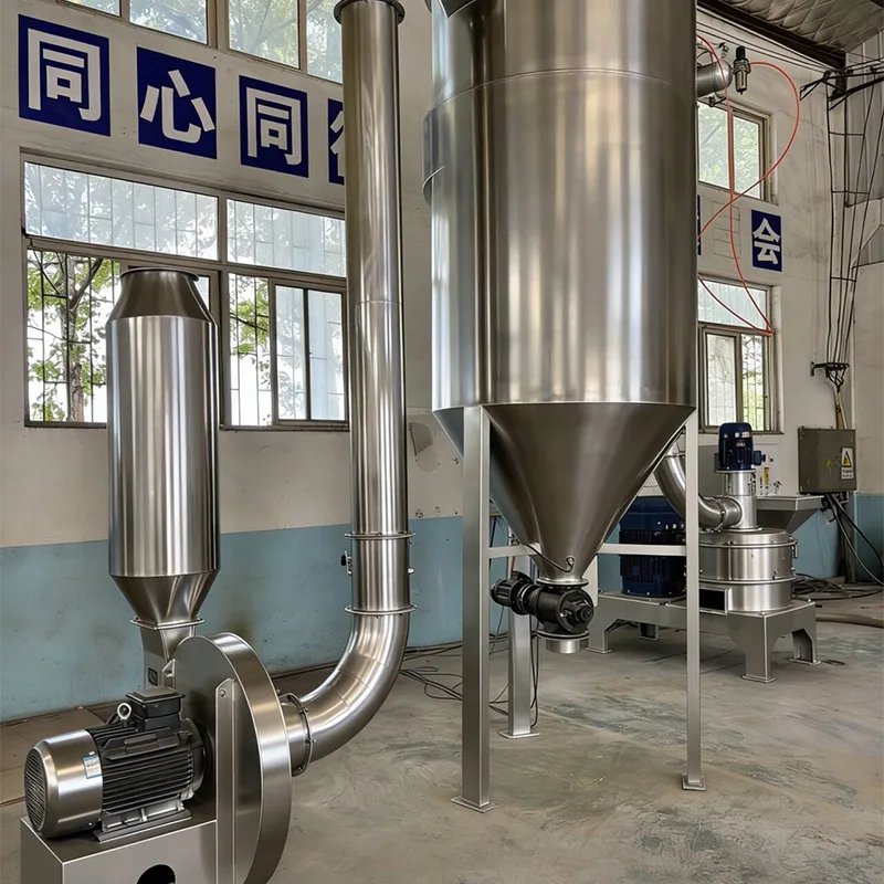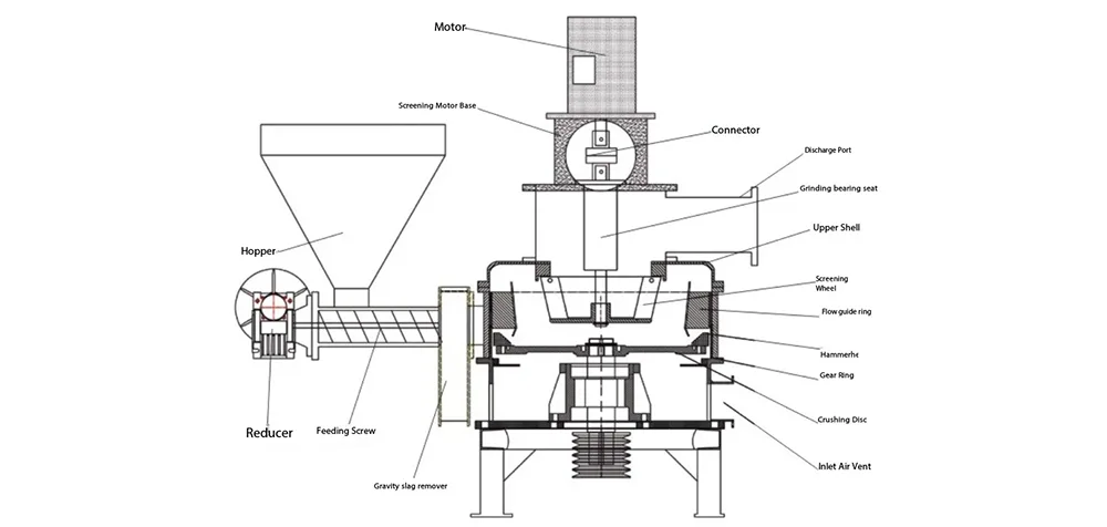 De specifieke verwerkingsstroom is eenvoudig: voer eerst de grove poedergrondstof met een deeltjesgrootte van niet meer dan 10 mm in de invoertrechter en transporteer deze vervolgens met een constante snelheid naar de breekkamer via een feeder met variabele frequentie; De slijpschijf in de maalkamer roteert met hoge snelheid, waardoor de slijphamer en de slijprol synchroon met hoge snelheid lopen, een sterke middelpuntvliedende kracht wordt gegenereerd en de grove poedergrondstof in de binnenwand van de maalkamer wordt gegooid; Onder invloed van de middelpuntvliedende kracht ondergaan grondstoffen ernstige botsingen, afschuiving en wrijving met slijtvaste bekledingsplaten, breekhamers en breekrollen, waardoor het voorbereidende verpletteren wordt voltooid; Na het aanvankelijk vermalen wordt het materiaal in de classificatiekamer gebracht door de luchtstroom onder negatieve druk die wordt gegenereerd door de ventilator met geïnduceerde trek. Het classificatiewiel in de classificatiekamer draait met hoge snelheid om nauwkeurig te classificeren op basis van de deeltjesgrootte. Het ultrafijne poeder dat aan de eisen voldoet (deeltjesgrootte kan naar behoefte worden aangepast) wordt door de luchtstroom in de opvangbak gebracht om de opvang compleet te maken; Grof poeder dat niet aan de deeltjesgrootte-eisen voldoet, wordt door het sorteerwiel onderschept en teruggestuurd naar de breekkamer voor secundaire vermaling totdat het de gespecificeerde deeltjesgroottenorm bereikt, waardoor de uniformiteit van het eindproduct wordt gegarandeerd.