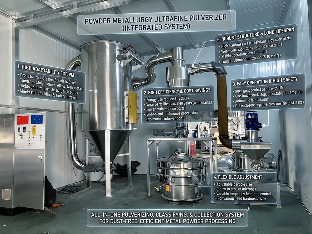 De ultrafijne poedermetallurgie-pulverizer is een gespecialiseerde apparatuur die speciaal is ontwikkeld voor de poedermetallurgie-industrie. Het wordt voornamelijk gebruikt voor de ultrafijne verwerking van metaalpoeders, legeringspoeders en verschillende niet-metaalhoudende poedergrondstoffen, en kan zich perfect aanpassen aan de grondstoffenverwerkingsvereisten van het gehele productieproces van de poedermetallurgie. Vergeleken met gewone breekapparatuur is het meest opvallende kenmerk van de ultrafijne poedermetallurgie-vergruizer de naleving van de strikte normen van de poedermetallurgie-industrie, die de deeltjesgrootte van het poeder nauwkeurig kan regelen, een uniforme deeltjesverdeling kan garanderen en secundaire vervuiling volledig kan vermijden, waardoor de hoge zuiverheid van het afgewerkte poeder wordt gewaarborgd en volledig wordt voldaan aan de kernvereisten van daaropvolgende vorming, sinteren en andere processen.