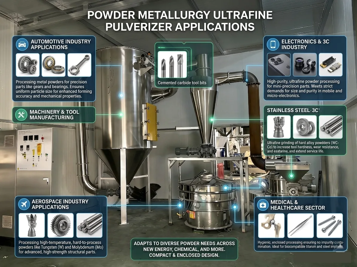 De ultrafijne poedermetallurgie-pulverizer wordt voornamelijk gebruikt voor de ultrafijne verwerking van grondstoffen in de gehele poedermetallurgie-industrie en kan zich aanpassen aan de breekbehandeling van verschillende metaal-, legerings- en niet-metaalpoeders. Het wordt veel gebruikt op meerdere gebieden, zoals de automobielsector, machines, elektronica, ruimtevaart, medische sector en gereedschapsproductie. De specifieke toepassingsscenario's zijn als volgt: