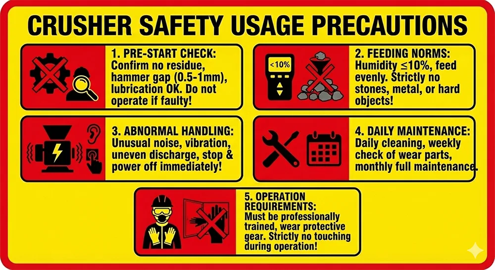 Behandeling met uitzondering: Wanneer de apparatuur in werking is en er vreemde geluiden, hevige trillingen of verschillende diktes van verpletterde materialen optreden, moet deze onmiddellijk worden gestopt en moet de stroom worden uitgeschakeld. Controleer eerst of de hamer versleten is of dat de sorteerschijf geblokkeerd is. Nadat u het probleem heeft opgelost, start u de machine opnieuw op.